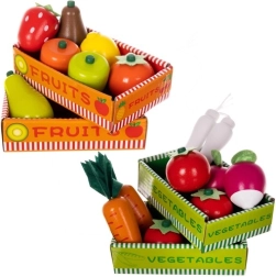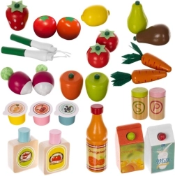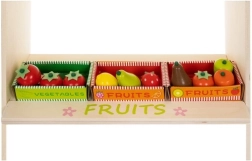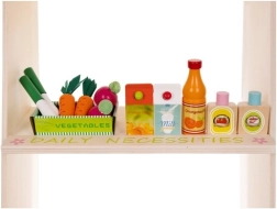 stand, forgatható tábla/óra, mérleg, pénztárgép szkennerrel, bankkártya, 4 kosár gyümölcshöz és zöldséghez, fűszerek (só, bors), tej, narancslé üvegben és dobozban, paradicsomszósz, chiliszósz, pudingok (alma, őszibarack, áfonya), 2× répa, 4× paradicsom, 2× retek, 2× póréhagyma mágnessel, citrom, 2× körte, eper, paprika, alma, színes csomagolás, barna szállítódoboz