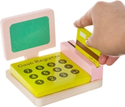 Pénztárgép szkennerrel, mérleg, forgatható tábla és sok fa élelmiszer – minden, amire a gyerekeknek szükségük van saját boltjuk megnyitásához és a szociális készségek gyakorlásához.
