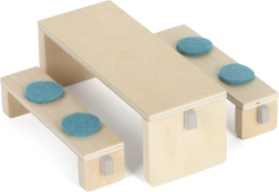 Az étkezőasztal padokkal és puffokkal otthonos környezetet teremt a babák számára.
