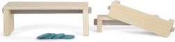 Ez a szépen megtervezett konyhai készlet babaházhoz valósághű játékélményt nyújt. Magas konyhaszekrényből, mosogatós és főzőlappal ellátott szigetből, valamint két paddal és puffokkal ellátott étkezőasztalból áll. A konyhaszekrény kombinált hűtő-fagyasztóval és nyitható sütővel van felszerelve.