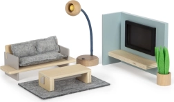 Ez a gyönyörűen kidolgozott bútorszett valósághű elemeket hoz a gyermekjátékokba, amelyek fejlesztik a kis építészek és tervezők fantáziavilágát. A gyerekek a játék részévé válhatnak a „tévéműsor” kártyák cserélésének köszönhetően, miközben az állólámpa igazi nappali hangulatot teremt.