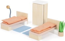 A Small Foot márkájú miniatűr babaszoba a gyermekek világába hozza el a valódi bútorok varázsát. Ez az elegáns bútorkészlet tartalmaz kétszemélyes ágyat, amely könnyen két különálló ágyra osztható, így különféle játékformáknak adva rugalmasságot. Két párna, két paplan, tükrös ruhásszekrény, lámpa és két szőnyeg is része a miniatűr szoba hitelességének.