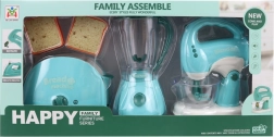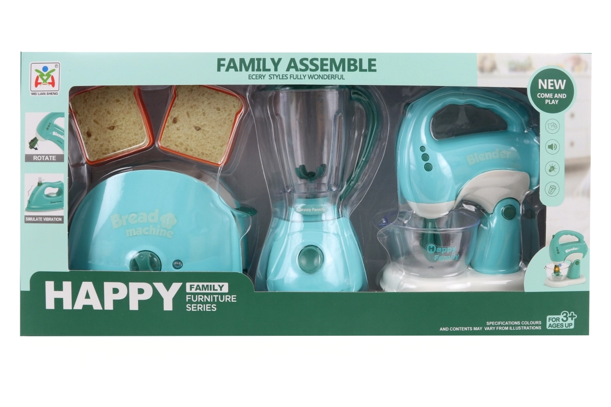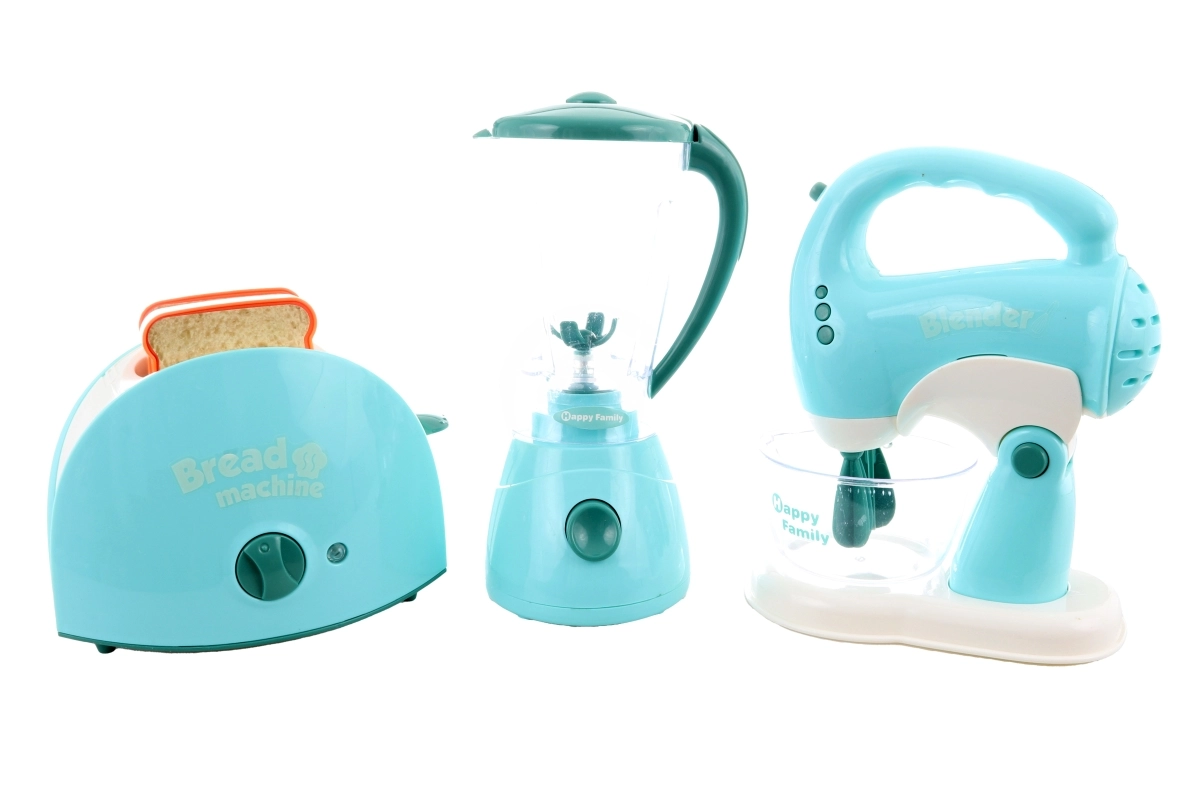 Ez az elemes konyhai készülék szett egy kenyérpirítót, turmixgépet és habverőt tartalmaz. Mindegyik készülék 2 darab AA elemmel működik, amelyek nem részei a csomagnak. Az elemek behelyezése után a kenyérpirító világít és hangot ad, a turmixgép forog és hangot ad, a habverő világít, hangot ad, és a habverők forgásba lendülnek. Anyaga műanyag. Dobozban csomagolva. A csomag mérete kb. 43×22×9,5 cm. Ajánlott életkor: 3+.