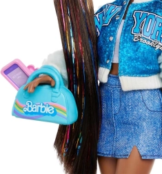 A Barbie Dream Besties „Brooklyn” baba készen áll, hogy ragyogjon a táncparketten. Csillogó kék dzsekije, farmer szoknyája és stílusos magassarkú cipői markáns, New York-i megjelenést kölcsönöznek, amely ösztönzi a gyerekek képzeletét. A hosszú, sötét, színes tincsekkel feldobott haj kiválóan alkalmas fésülésre és frizurák formázására.