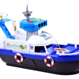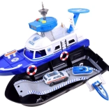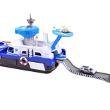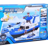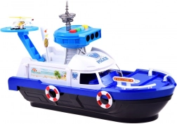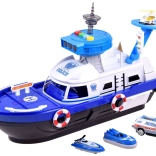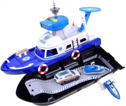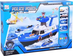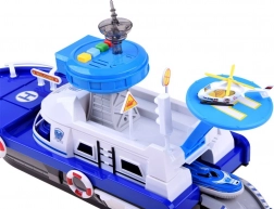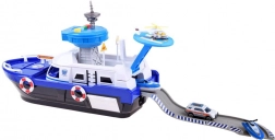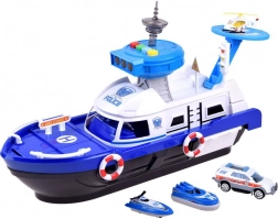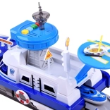 Ez a részletgazdag rendőrségi hajó fehér–kék színösszeállításban készen áll minden küldetésre – vízen, szárazföldön és a levegőben. A fedélzeten helipad helikopterrel, irányítótorony fény- és hangeffektekkel és belső tárolóhely található a járművek szállításához. A kormánnyal ellátott nyitható pilótafülke és a kapitány figura még élethűbbé teszi a játékot.