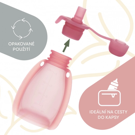 Biztosítsa gyermekének a friss és egészséges uzsonnát újratölthető szilikon tasakunkkal, amikor csak kedve támad hozzá. Ez a praktikus segítőtárs lehetővé teszi, hogy otthon készítsen gyümölcspürét vagy más kedvenc finomságokat, amelyeket magával vihet kirándulásra, sétára vagy az iskolába. A biztonságos, visszazárható kupaknak köszönhetően a tartalom friss marad, és védett a kifolyástól.