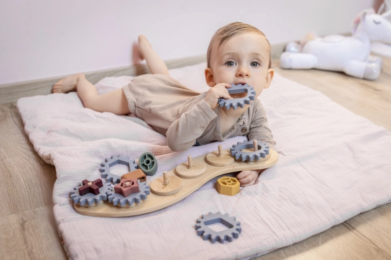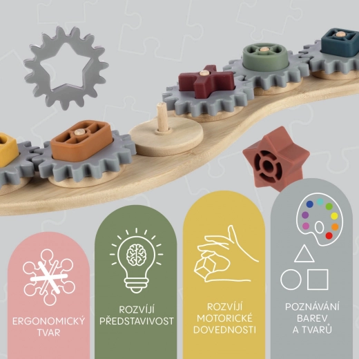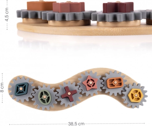 Fedezze fel a tanulás varázsát bambusz-szilikon kirakónkkal, amely ötvözi a szórakozást és a felfedezést. A színes fogaskerekek fejlesztik gyermeke finommotorikáját, logikus gondolkodását és képzeletét. A természetes bambusz és a biztonságos szilikon kombinációja kellemes szenzoros élményt nyújt, és támogatja a mechanika világának természetes felfedezését.