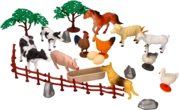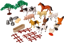 A készlet különböző méretű műanyag állatokat tartalmaz, köztük teheneket, lovakat, bárányokat, tyúkokat, fákat és további kiegészítőket, mint kerítések, kövek és tojások, amelyek biztosítják az oktatási és kreatív fejlődést.