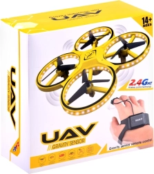 Kvadrikopter UAV gravitációs érzékelővel - egy szórakoztató ajánlat gyerekeknek és idősebbeknek, akik szeretik a repülő játékokat. A teljesen automatizált drón műanyagból készült, fantasztikus LED-világítással, amely remekül mutatja meg magát sötétedéskor. A drón különleges távirányítóval irányítható, amely az ember kezére van rögzítve, mint egy óra. Kezünkkel irányítjuk, a játék széles lehetőségeket kínál a manőverezésre, elég egy finom kézmozdulat, hogy megváltozzon a repülési irány, jobbra, balra, fel, le. Kibocsátás után a levegőben marad és körbe forog a saját tengelye körül 360 fokban. A pánt rögzíthető a csonton keresztül, csúsztatható közben a hüvelykujjunkkal a heveder között, húzhatjuk a szíjhoz a mutatóujjunkkal nyomógombot is. A szilikon szíjnak 12 fokozatú szélességének beállítása van, ami mindenki számára megfelelő lesz. A játék könnyű, így gyorsan felemelkedik a levegőbe, a benne alkalmazott 4 ellentétes propeller növeli a stabilitását a repülés közben.