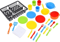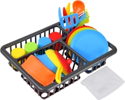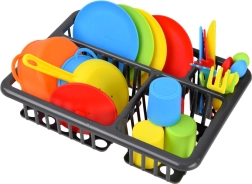 A csomagban minden benne van, amire a kis szakácsoknak szükségük van: a fedeles lábastól és a serpenyőtől a wokon át egészen a tányérokig, bögrékig és a négy személyre szóló evőeszközökig. A praktikus csepegtető segít rendet tartani.