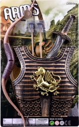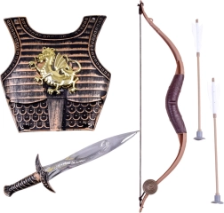 A szett páncélt, íjat, két nyilat és kardot tartalmaz – ideális kombináció fantáziacsatákhoz és farsangi jelmezekhez.