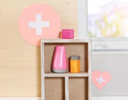 A készlet rózsaszín orvosi eszközöket tartalmaz, mint például ollót és maszkot, amelyek ideálisak a doktoros játékhoz.