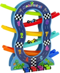 A fából készült versenypálya 1-től 8-ig számozott, ami segíti a gyerekeket a formák és megjelenés megismerésében. A számozott fa autókat csak fel kell helyezni a pálya tetejére, és nézni, ahogy gyorsan lefelé mozognak. Itt az ideje egy kis versenynek!