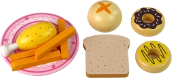 A készlet tartalmaz egy tányért és válogatott ételeket: fánkokat, péksütit, hasábburgonyát és csirkecombot – ideális tálaláshoz és szakácsos játékhoz.