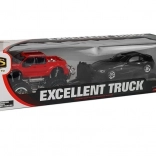 Ez az értékes készlet ötvözi a masszív piros monster truckot a levehető autószállító platóval és a részletesen kidolgozott sportos BMW-vel. A játékok ütésálló műanyagból készültek, amely bírja a keményebb bánásmódot, így kiválóan alkalmasak otthoni pályákhoz és terepes kalandokhoz is.