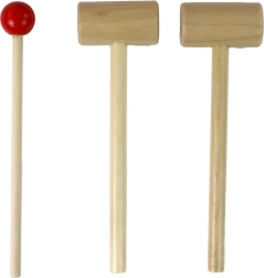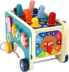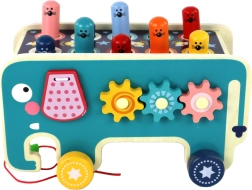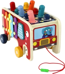A készlet teljes: tartalmaz egy húzózsinórral ellátott kisautót, 2 kalapácsot a „Whac-a-Mole” játékhoz és egy cintányér-ütőt. A játék ráadásul egészségre ártalmatlan fából készült, amely tartósságot és biztonságot garantál a gyerekek számára.