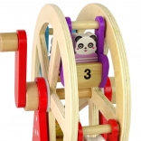 A fa óriáskerék tartós, strapabíró és gyönyörűen színezett játék 3 éves kortól. Elég elfordítani a piros kurblit, és figyelni a kerék egyenletes forgását – a gondolák számozottak, ezáltal játékosan ösztönzik az első számolást. A készlet öt vidám figurát tartalmaz (panda, tigris, nyuszi, medve, víziló), akik „beszállhatnak” a kabinokba.
