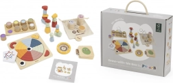 Ez a gondosan összeállított doboz hároméves kortól a mindennapi felfedezéshez változatos játékokat és tevékenységeket kínál. A nyolcféle textúrával rendelkező szenzoros tábla erősíti a taktilis érzékelést, a mintakártyákkal kiegészített körpuzzle támogatja a logikus gondolkodást és a kéz–szem koordinációt, míg a fa érzelemkönyv érzékenyen tanítja a gyerekeket az érzések felismerésére és megnevezésére. További móka a színes egyensúlyozó kövekkel, egy egyszerű mini labirintus a türelem fejlesztésére, valamint egy memóriajáték a koncentráció edzéséhez.