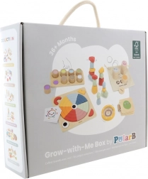 A minőségi fának és a finom pasztell színeknek köszönhetően a doboz biztonságos és esztétikus választás a gyerekszobába és az óvodába is. A füllel ellátott hordozható doboz megkönnyíti a tárolást és az utazást, így a játékos tanulás bárhol megvalósulhat.