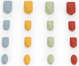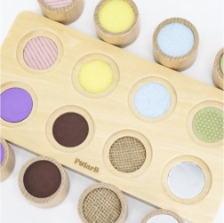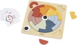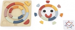 A feltűnő színekkel és mintakártyákkal ellátott fa kirakó megtanítja a gyerekeket tervezni, mintákat követni és pontosan illeszteni az alakzatokat. Fejleszti a logikát, a türelmet és a kéz–szem koordinációt.