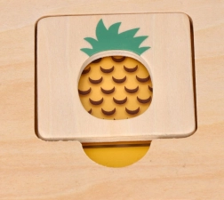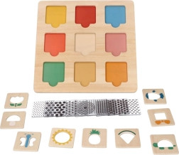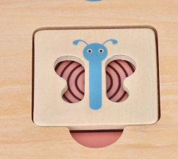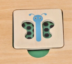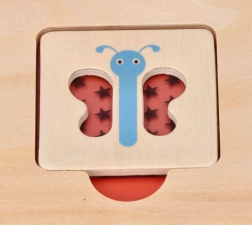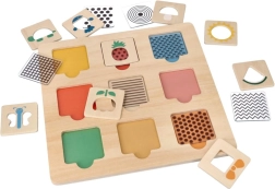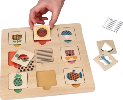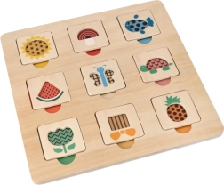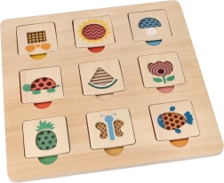 Ez a fából készült oktató kirakó felfedezésre ösztönzi a gyerekeket. A színes motívumok (állatok, virágok és egyéb minták) csábítanak az elemek beillesztésére és csúsztatására, ami természetes módon fejleszti a szem–kéz koordinációt és a türelmet. A masszív fa alaplapnak és a könnyen megfogható elemeknek köszönhetően a játék intuitív és biztonságos.