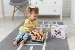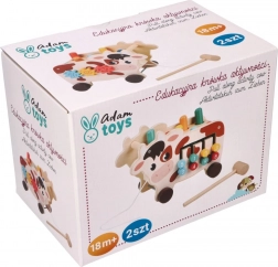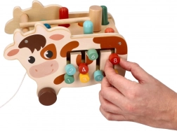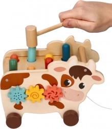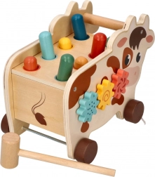 Ez a fa tehénke ideális választás a szórakoztató tanuláshoz otthon és az óvodában is. A kalapáccsal beütögethető csapok, a színes fogaskerekek és a számtani tevékenységek kombinációjának köszönhetően a gyerekek gyakorolják a figyelmet, a szem–kéz koordinációt és az első számolást. A játék mobilis – kerekekkel és húzózsinórral rendelkezik, így a világ felfedezése közben is társként kísérheti a gyerekeket.
