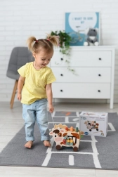 A színes csapok és a számozott elemek támogatják az első számolást, a válogatást és a színek felismerését. A praktikus zsinór és a kerekek húzójátékká is teszik.