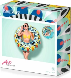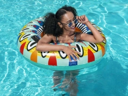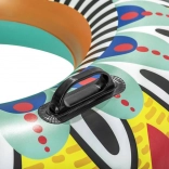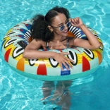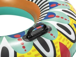 A Fiesta úszógumi élénk grafikájával és színes megjelenésével visszahozza a stílust és az örömöt a medencébe. A 107 cm-es átmérő és a két fekete fogantyú a könnyű megfogásért biztonságot nyújt 12 éves kortól és felnőttek számára is. Az integrált biztonsági szelep megkönnyíti a felfújást és a leeresztést, így a tárolás gyerekjáték.