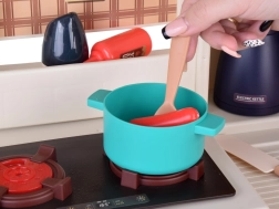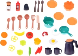 Fedeles fazék, lábas, kanna, csészék, tányérok, evőeszközök, merőkanál, spatula, szűrő és ételek makettjei – minden, amire a kis szakácsoknak szükségük lehet.