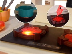 A főzőlap szimulálja a főzést: világító égők, bugyborékoló hangok és finom gőz serkentik a fantáziát, és még valósághűbbé teszik a játékot.