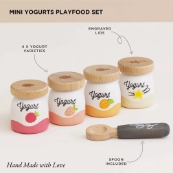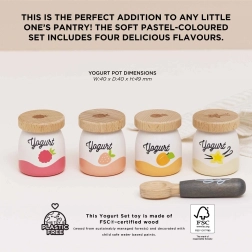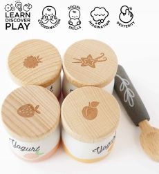 Egészséges kezdés gyermekeinek! A Le Toy Van fa joghurt szettje játékos módon tanítja a gyerekeket az egészséges és kiegyensúlyozott táplálkozásra. Négy különböző ízű joghurtmakettet és egy fa kanalat tartalmaz, ideális ajándékként.