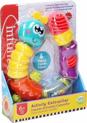 A bájos, összeilleszthető, hernyó alakú csörgő rengeteg szórakozást és fejlődési támogatást nyújt a 6 hónapos kortól. A 6 összekapcsolható elemnek köszönhetően fejleszti a finommotorikát, a kéz–szem koordinációt, és a csörgők hangjával serkenti a érzékszervi észlelést.