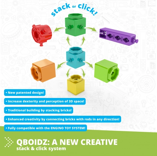 Az Engino Qboidz sorozatot kifejezetten a legkisebb gyerekek számára tervezték, támogatva kognitív és motoros készségeiket szórakoztató és kreatív játékkal. Az elemek színesek és könnyen kapcsolhatók, ami megkönnyíti a kezelést és a konstrukciót.