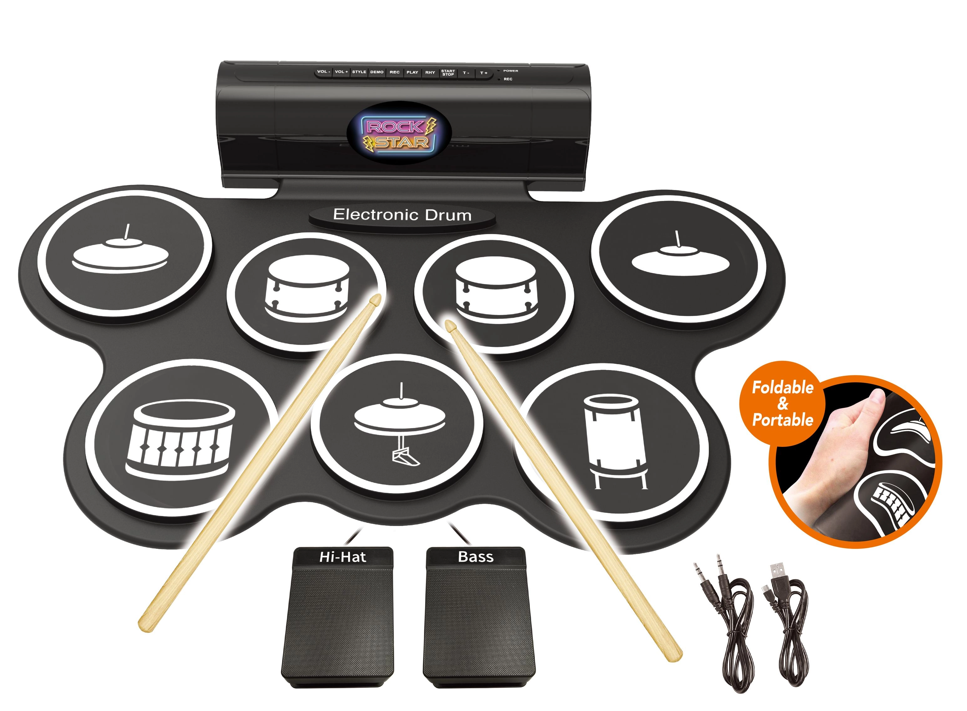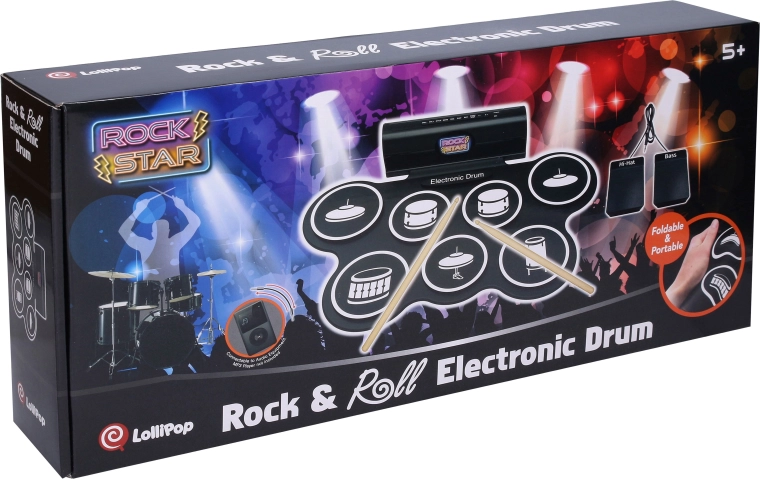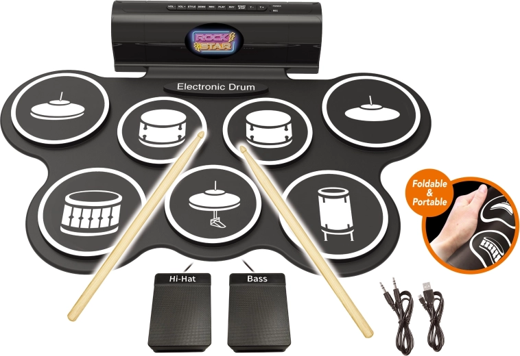 Kompakt elektronikus dobkészlet otthoni játékhoz és kezdőknek, amely 7 valósághű hangzást, 2 pedált (hi-hat és nagydob), fény- és hangeffekteket, valamint felvételi és lejátszási lehetőséget kínál. A csomag tartalma 3× AA elem, USB-kábel és kábel mobil/mp3-hoz.
