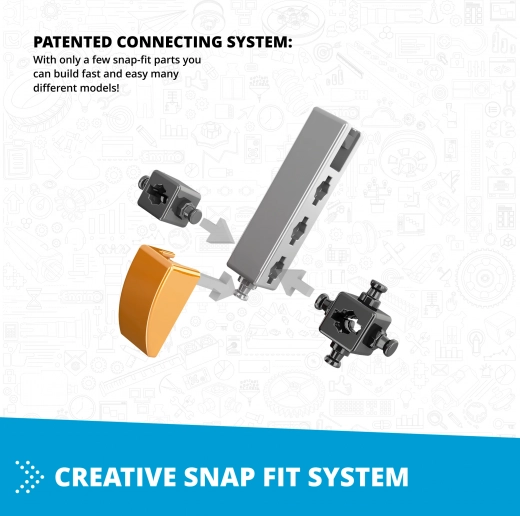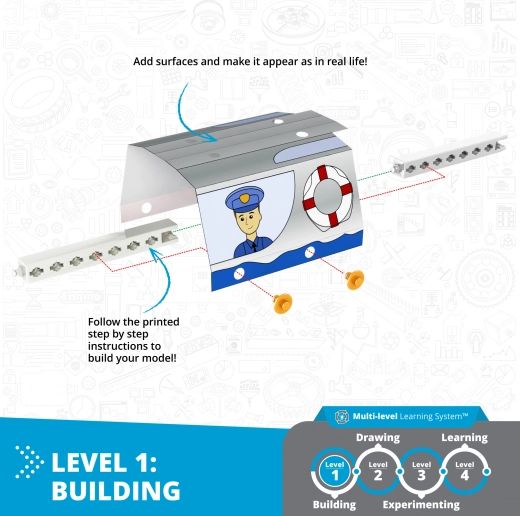 A jól átgondolt szinteknek köszönhetően – az egyszerű összeszereléstől a papírelemek kreatív kiszínezésén át egészen a saját kísérletekig – a kis kutatók játékos formában sajátítják el a tudományt. Az interaktív Engino kidCAD alkalmazás 3D modelleket jelenít meg, és lépésről lépésre megkönnyíti az építést.