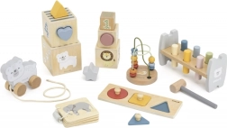 Fedezze fel az okos, fából készült készletet a legkisebbeknek, amely fejleszti a finom- és nagymotorikát, a kéz–szem koordinációt, valamint a formák és színek felismerését. A praktikus, fogantyús ajándékcsomag népszerű tevékenységeket rejt – átbújtatós kalapácspadot, öt szintes kockatornyot, gyöngy labirintust, formabedobókat és húzható mackót – mindezt biztonságos, minőségi fából.