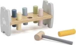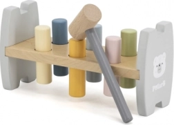 Színes csapok és fa kalapács segítik az ütés pontosságát, a kéz–szem koordinációt és a csukló rugalmasságát – ideális az első motorikus sikerekhez.