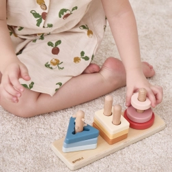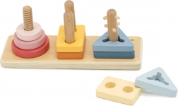 Fa elemek és pálcikák segítenek felismerni a formákat és színeket, támogatják a téri gondolkodást és a logikus válogatást. Ideális első lépések a geometriában.