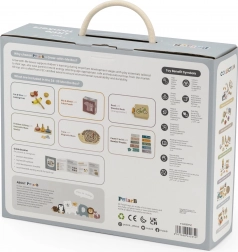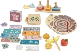 A csomag tartalmaz mágneses sün-labirintust, kirakókat és puzzle-t, vágó gyümölcskészletet és fa képeskönyvet közlekedési eszközökkel. Minden praktikus, fogantyús dobozban kap helyet a könnyű hordozhatóságért. Ideális választás kis felfedezőknek, akik készen állnak a fejlettebb feladatokra.