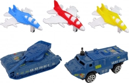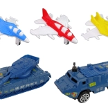Három színes vadászgép, lánctalpas tank és egy páncélozott jármű fém karosszériával hozza el az akciót tengeren és szárazföldön.