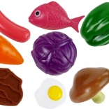 A készlet különféle élelmiszereket is tartalmaz, amelyek ösztönzik a fantáziadús játékot, és segítenek megtanulni az ételek nevét és formáját.