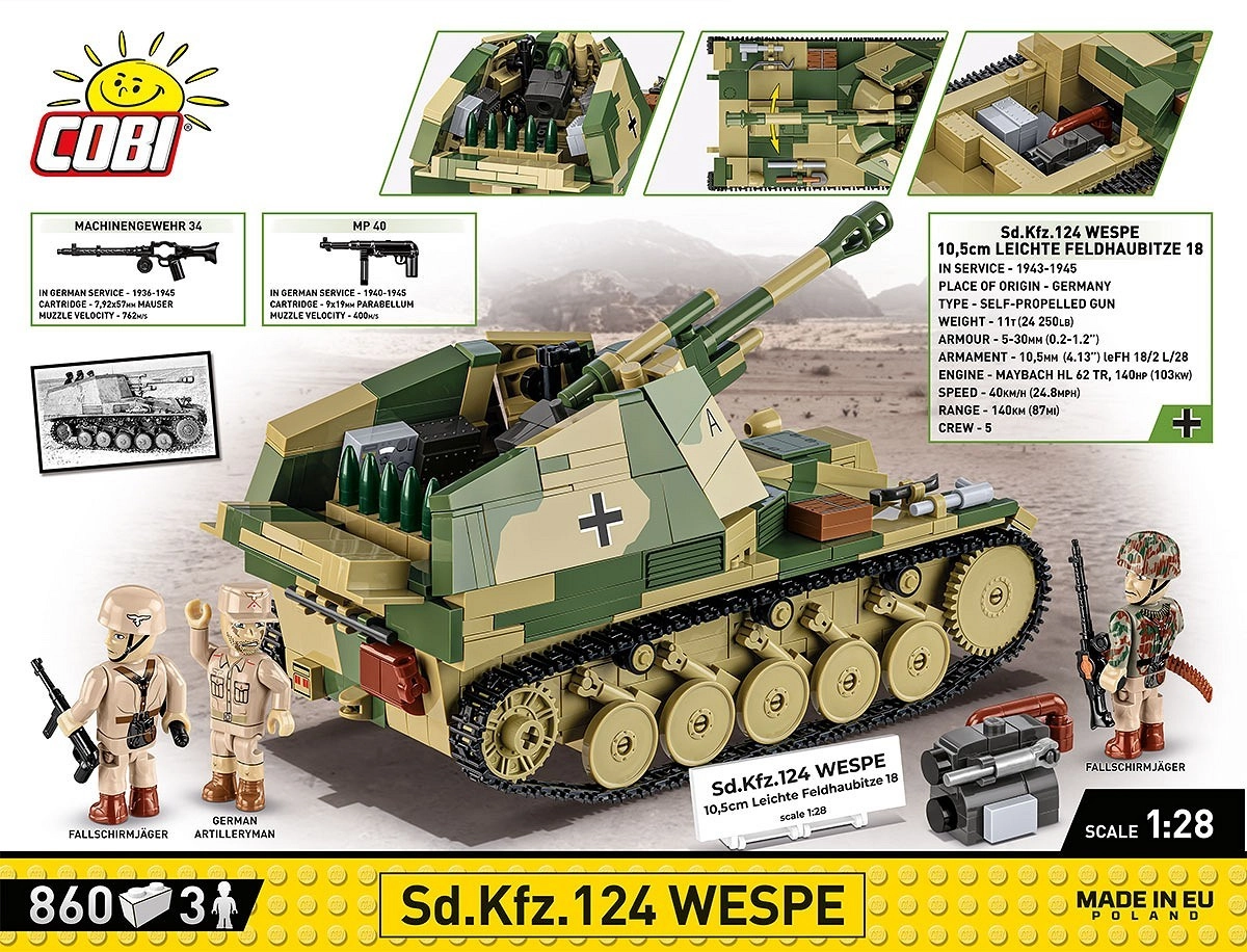 Sd.kfz.124 Wespe építőkészlet ideális választás a COBI műhelyéből származó történelmi összeállítások rajongóinak. Ez a készlet bővíti a Panzer II tank alvázára épülő járművek sorát, és a Wespe önjáró löveget mutatja be. Az Executive kiadású modell 855 elemből áll, és 1:28-as modellezési méretarányban készült.