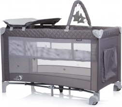 Csomag tartalma: összecsukható ágy, második szint puha betéttel, pelenkázó lap, rekesz/organizer, függesztett ív 3 plüssjátékkal, hordtáska.
