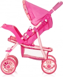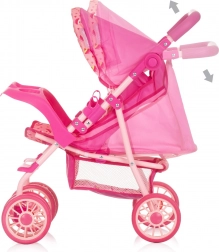 A modern játékbabakocsi vidám, rózsaszín dizájnjával valósághű szerepjátékot kínál. A nagy, dupla kerekeknek köszönhetően a haladás egyenletes és stabil, az állítható tető védi a játékbabát, a háttámla pedig könnyen állítható az ülő helyzettől egészen a fekvőig. A magasságban állítható tolókar a gyermek magasságához igazítható, így a babakocsi kényelmesen irányítható.