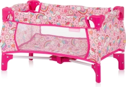 Stabil keret és minőségi, unikornis mintás textil. A kiságy hálós oldalai jobb rálátást biztosítanak, a kényelmes etetőszék a babák etetéséhez pedig támogatja a biztonságos játékot.