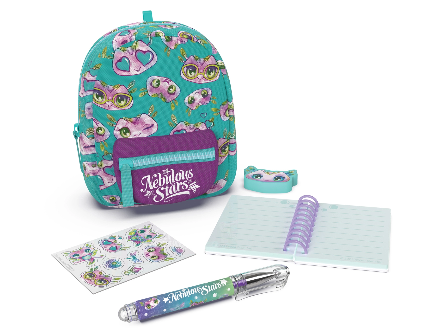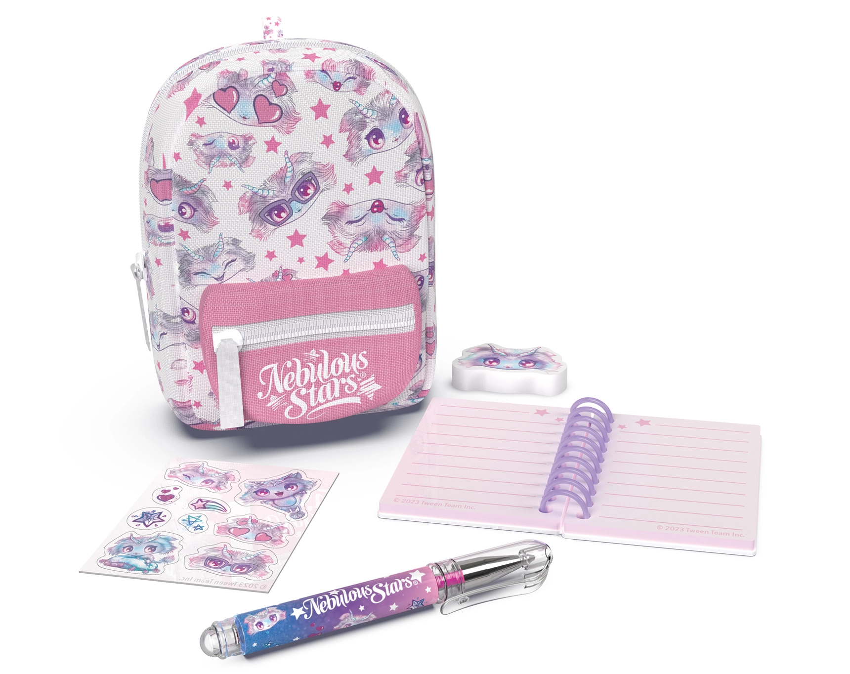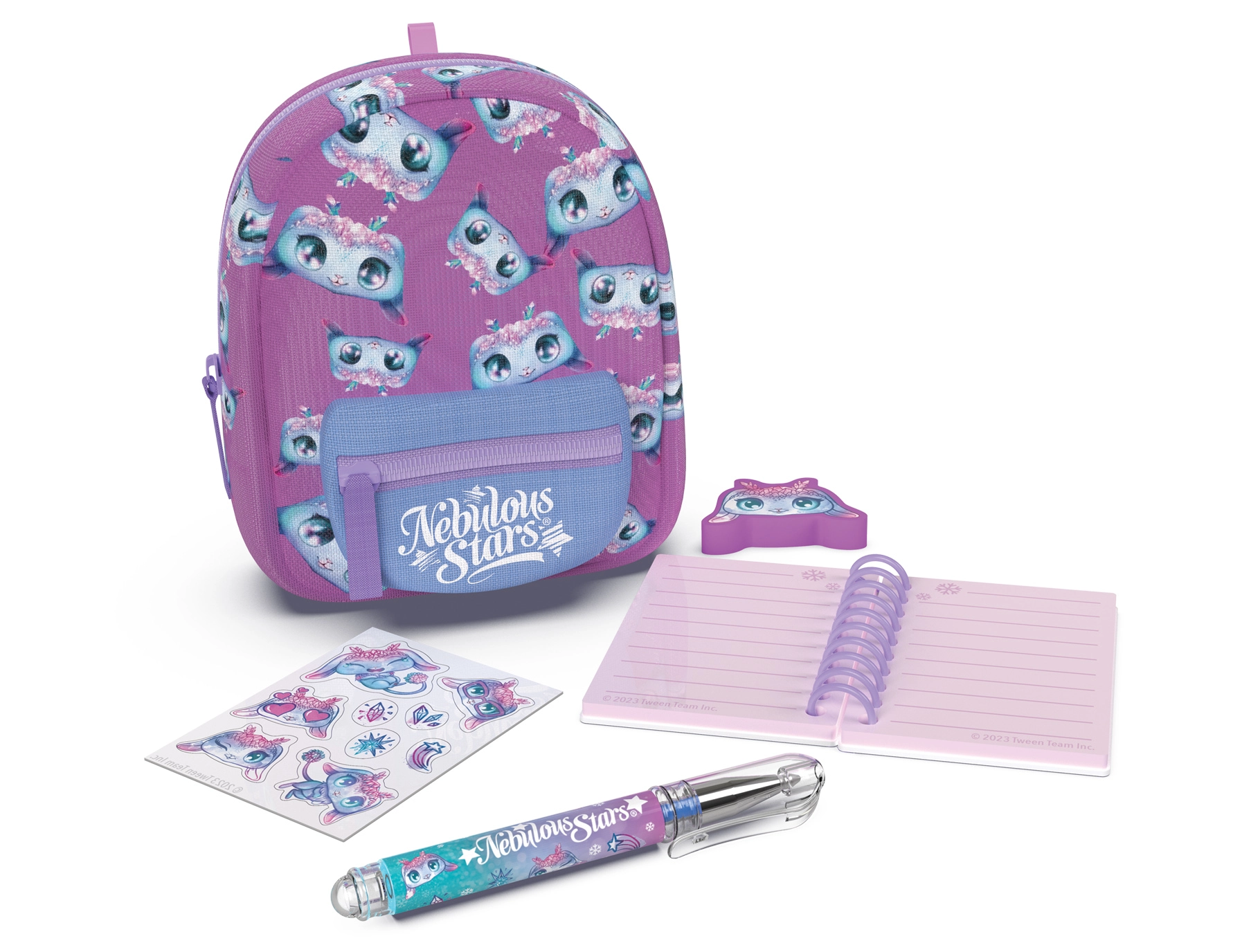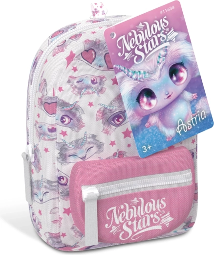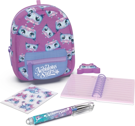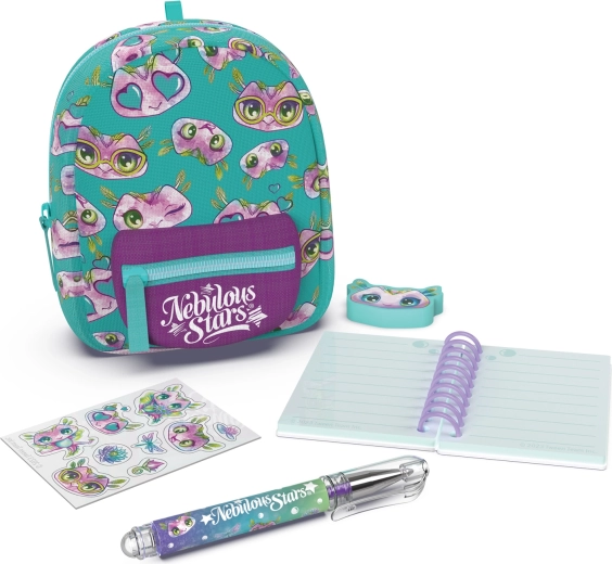 Stílusos mini NEBULOUS STARS hátizsák papírárukészlettel, ideális a kis alkotóknak és utazáshoz. A kompakt 9 × 6 × 11 cm méretben mindent rejt, amire szükség van: vonalas jegyzetfüzet, toll, radír, matricák és egy aranyos kulcstartó. 3 színváltozatban érhető el – kék, fehér és lila.