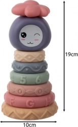 A karikák felhúzása és a stabil torony építése fejleszti a fogást, a kéz–szem koordinációt és a türelmet. Az elemek méretei egymásra épülnek, a gyermek elsajátítja a sorba rendezést a legnagyobbtól a legkisebbig.