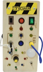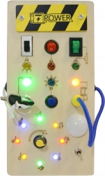- Interaktív elemek: kapcsolók, gombok, kulcs, konnektor dugóval, színes LED-ek