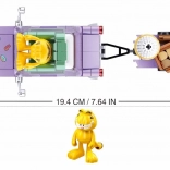 Építs lila autót „Garfield” oldaldísszel, és csatlakoztasd az utánfutót a tematikus kiegészítőkkel – ideális játékhoz és kiállításhoz is.