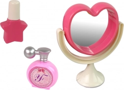 Szívecske alakú tükör állvánnyal, „körömlakk” és „parfüm” (imitáció) serkentik a fantáziát és támogatják a szerepjátékot a gyerek szépségszalonban.